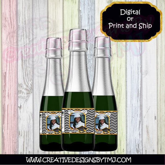 Graduation water bottle label Baby Birthday Personalized water bottle labels Graduations Treat Black and Gold Shower Favor Champagne Labels